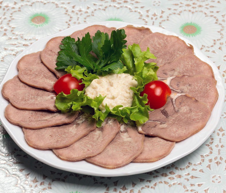 ЯЗЫК ОТВАРНОЙ С ХРЕНОМ Язык отварной, хрен, зелень. 150 г. Страй двор